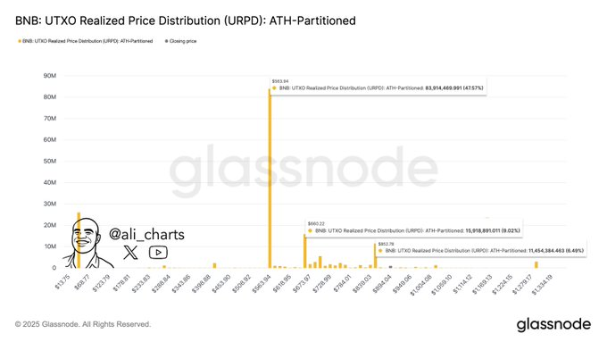 通过已实现价格分布确定的三个核心支撑位持续影响BNB走势。根据Ali(@ali_charts)分享的URPD图表,最密集的持仓集中在853美元水平。该区域拥有最强大的供应集群,反映了链上广泛的历史交易活动。