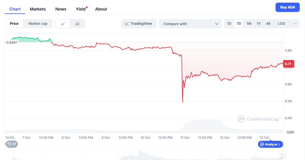 在最新市场崩盘后,卡尔达诺价格已回升至0.62美元支撑位。CoinMarketCap数据显示,ADA正接近0.70美元水平,市场情绪逐渐转暖。