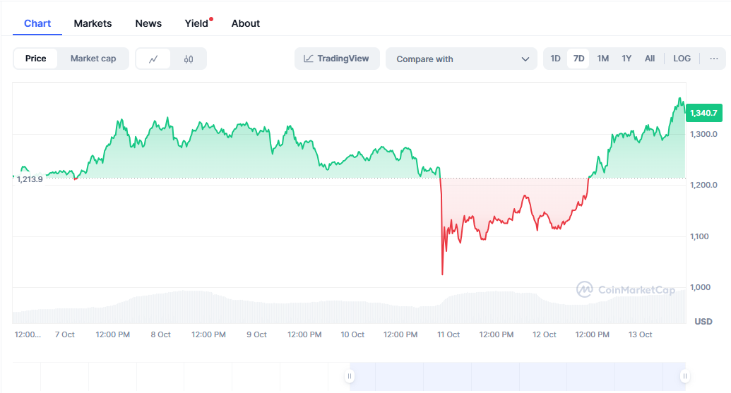 币安币价格在周末修正后出现回升。CoinMarketCap周线数据显示其涨幅达11.5%。