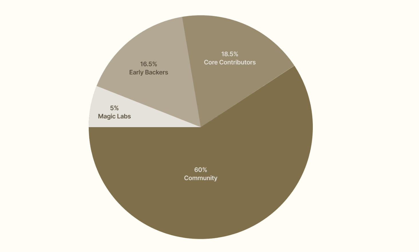 团队将总供应量的60%分配给社区建设,包括激励计划、奖励池、流动性提供、开发基金和财政储备。这种分配方式旨在推动生态增长并促进协议去中心化。剩余40%分配给内部利益相关方,包括核心贡献者、早期投资者和Magic Labs,这部分代币将按照解锁计划逐步释放。