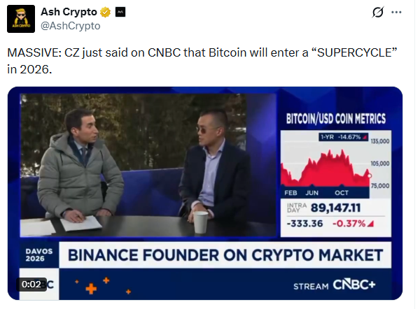 。在币安创始人赵长鹏(CZ)表示比特币可能即将打破其长期存在的四年周期之后,2026年比特币超级周期现已处于市场辩论的中心。在达沃斯世界经济论坛期间接受CNBC采访时,赵长鹏暗示,机构采用与监管明确性的罕见结合,可能会从根本上重塑未来几年比特币的行为模式。