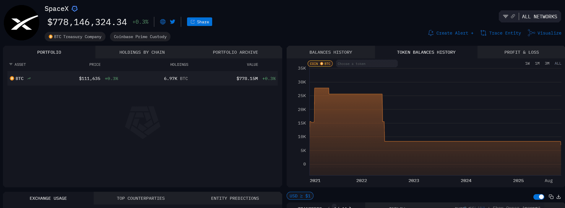 此次操作是本周系列大额交易的最新进展。转移前,SpaceX持有约8,285枚BTC(按当前11万美元/枚计算价值9.14亿美元),据BitcoinTreasuries.net统计,这使其位列私营企业比特币持仓第四位。