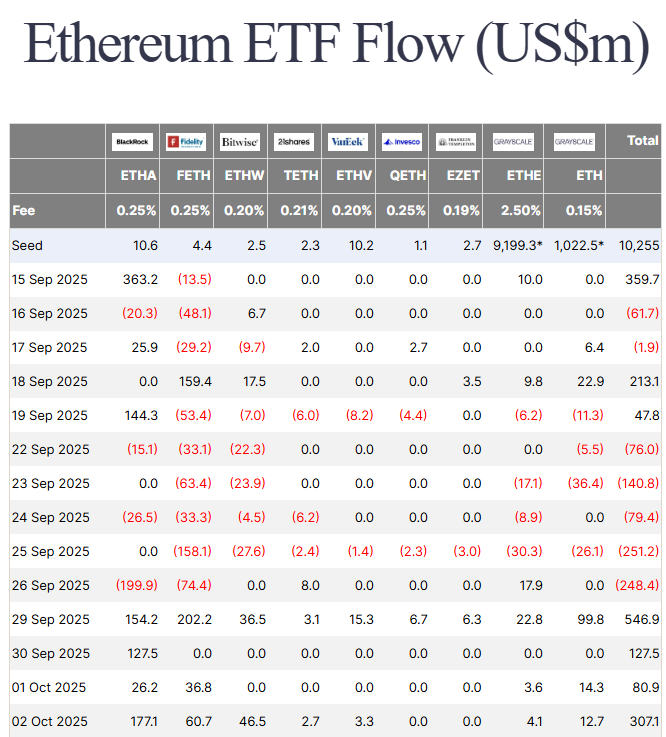 数据,以太坊ETF资金流向在上周连续五天流出后,本周转为净流入。10月2日单日净流入达3.072亿美元,截至周四当周总流入达10.6亿美元。