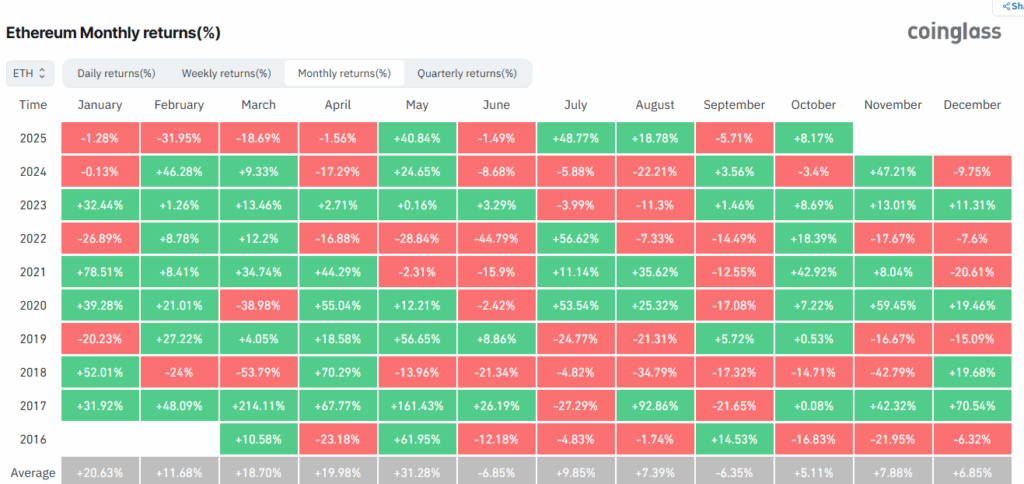CoinGlass数据显示,以太坊在10月的平均回报率为5%,11月和12月分别为8%和7%。
