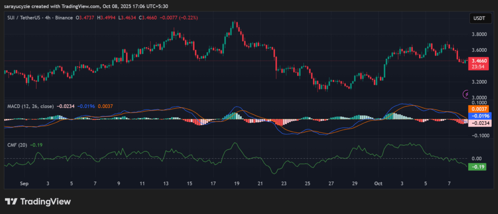 当SUI的移动平均收敛发散指标(MACD)线位于零线下方而信号线在其上方时,显示市场发出混合信号。虽然存在看跌压力,但可能形成短期反弹。此外,恰金资金流量指标(CMF)为-0.19,表明市场存在抛压,资金正流出该资产。