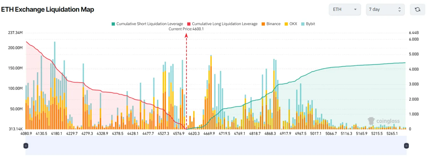 剧烈波动。ETH七日清算热力图显示,多头仓位(左侧红色区域)略超空头仓位(右侧蓝色区域)。这种失衡源于以太坊近期突破关键阻力位引发的市场乐观情绪,但若判断失误,看涨交易者可能承受更大损失。