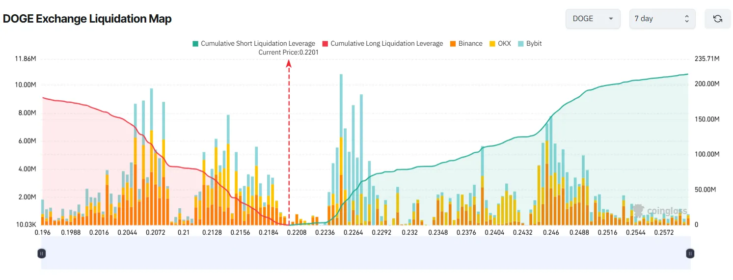 "从这里快速反弹至0.40-0.50美元区间,时机已到。"KALEO表示。这一预期与众多投资者对山寨币季的预判相符。若DOGE本周突破0.25美元,空头清算量可能超过2亿美元。
