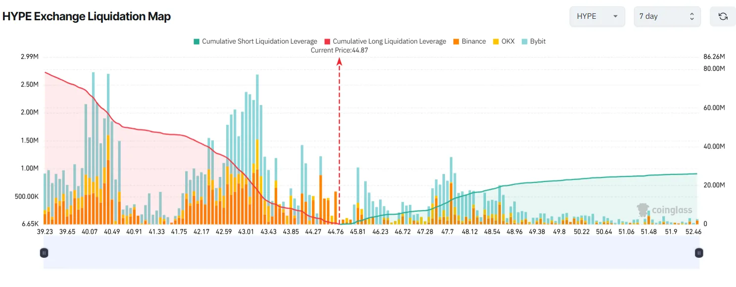 清算数据显示明显失衡,多头清算量远超空头。若HYPE本周跌至39美元,近8000万美元的多头仓位可能被清算;反之突破50美元则将清算约2400万美元空头仓位。