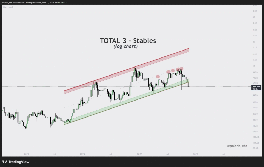据polaris_xbt分析,山寨币总市值已跌破支撑价格走势达两年之久的关键对数趋势通道。这一技术结构在“不含稳定币总市值”图表中清晰可见,该通道自2023年中形成并持续有效直至2025年11月。此次破位表明市场动能已发生根本转变。