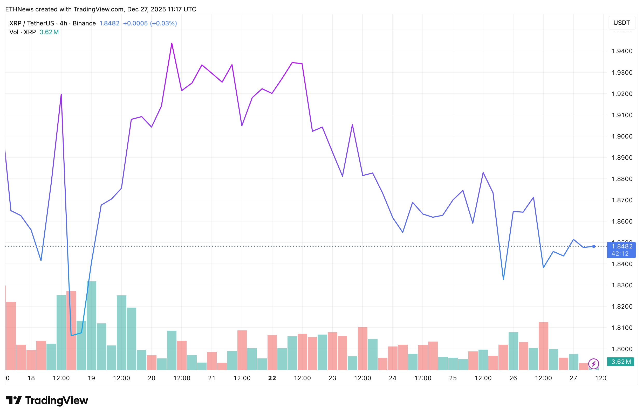 图表显示 XRP 此前曾试图上探 1.94 美元区域,但未能维持动能。这次受阻后出现了一系列更低的高点,表明上涨动能明显减弱。随后价格回落至 1.83–1.85 美元区间,抛压开始缓解。