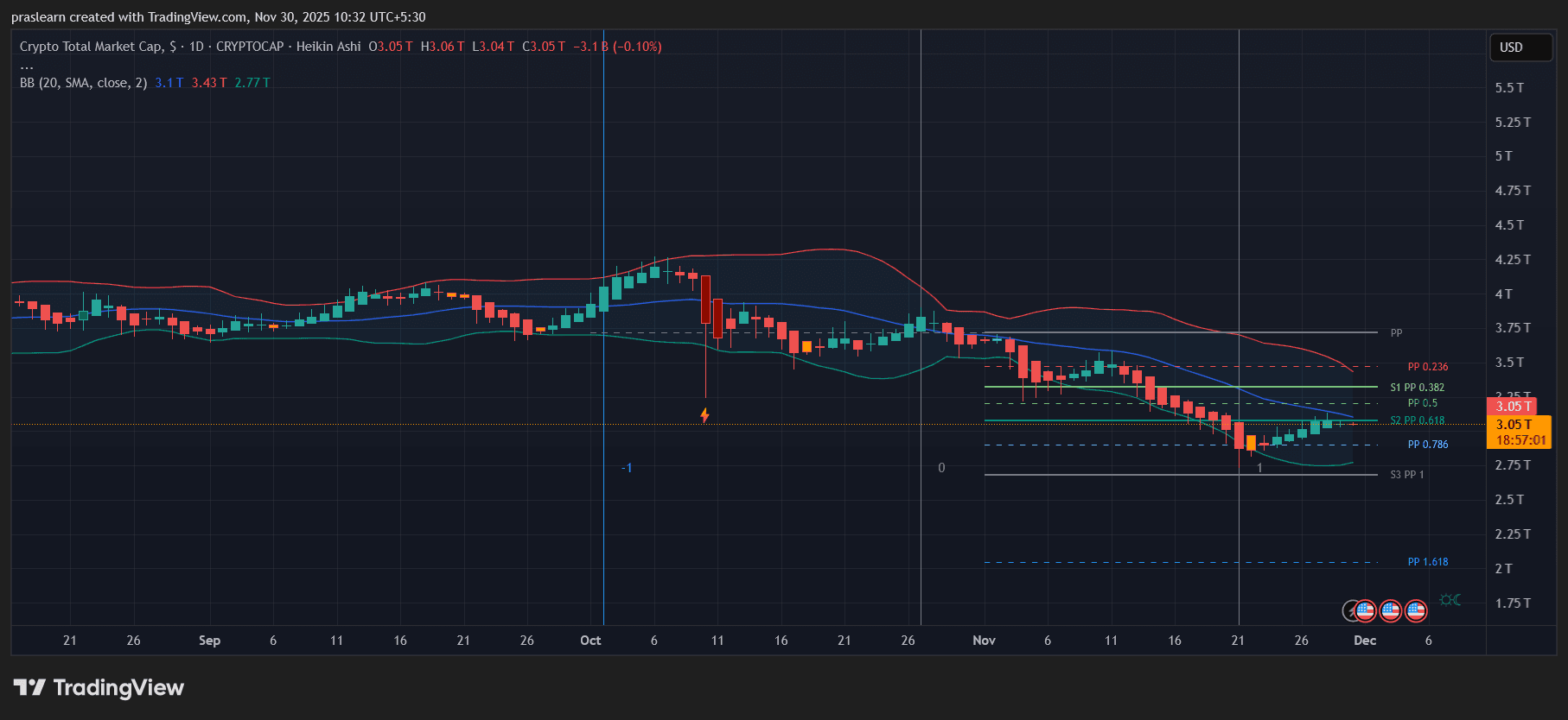 经历数周持续下跌后,加密货币总市值在3.05万亿美元附近获得暂时支撑,并显现温和反弹迹象。但随着美联储12月1日结束量化紧缩、以太坊Fusaka升级及FOMC利率决议等关键事件临近,交易员正以格外审慎的态度观察图表走势。当前的核心问题是:这轮复苏能否持续,还是宏观压力将迫使加密市场重回三万亿美元下方?