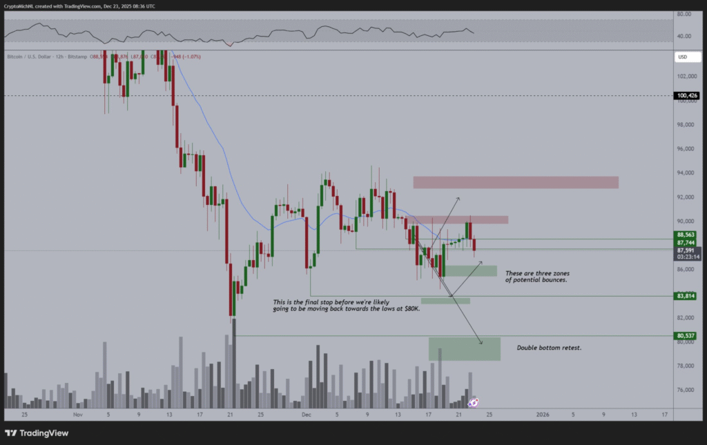 价格始终维持在87,500美元下方,市场情绪显得错综复杂。尽管比特币表现挣扎,但包括范德波普在内的一些分析师仍预期其未来可能实现突破。