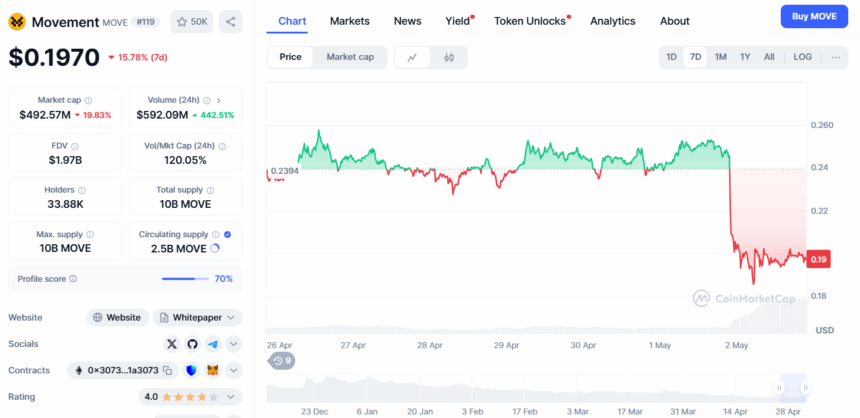 在过去7天内,MOVE币价格已下跌约16%。这一跌幅源于项目基本面的持续波动。目前,其市值已跌至4.9257亿美元,价格为0.1970美元,较历史最高价(ATH)1.45美元下跌了86.39%。