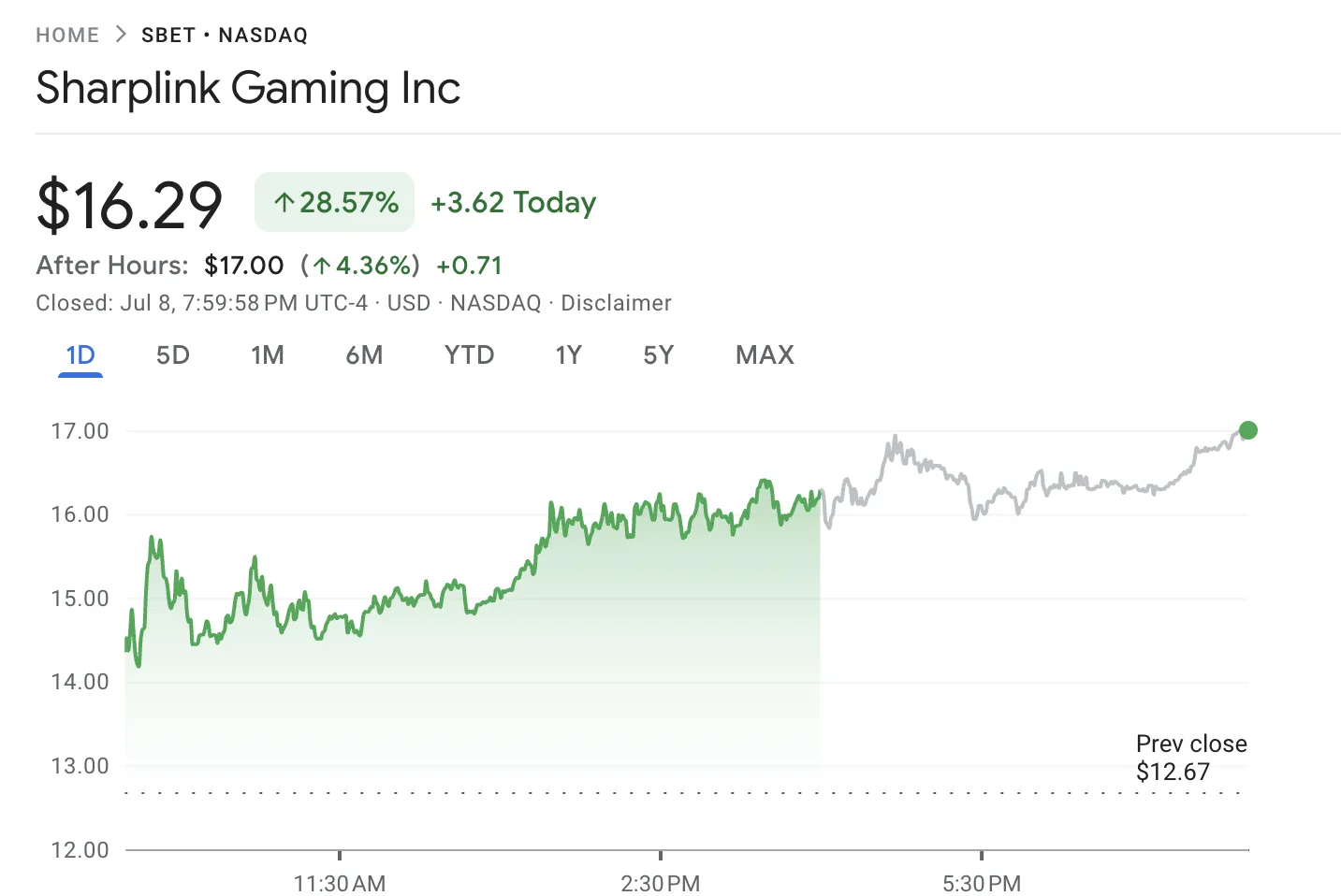 信息披露后,SharpLink Gaming股票(SBET)收盘上涨28.57%,盘后交易再涨4.36%。