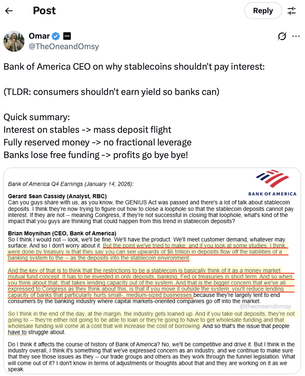 这番言论源于某加密投资者在社交媒体分享的美国银行财报电话会议截图。莫伊尼汉在会上援引财政部研究报告指出,若允许发行方支付利息,银行体系中大量存款可能转向稳定币。他表示此类产品将更接近“货币市场共同基金”模式,资金将存放于现金、央行准备金或短期国债而非用于贷款。