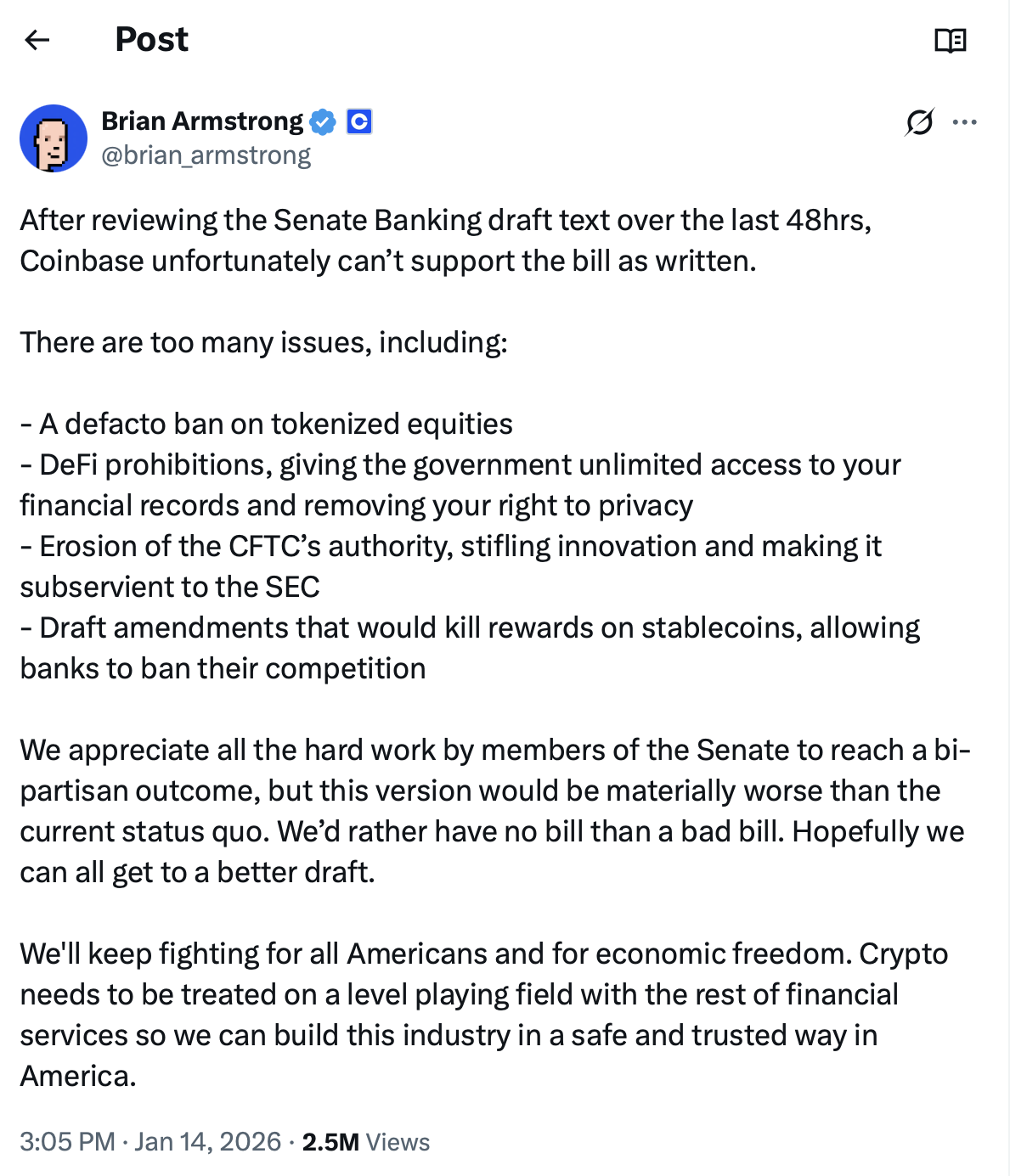 针对已获众议院通过、正待参议院审议的《数字资产监管清晰法案》,加密行业领袖立场出现分化。周三,Coinbase首席执行官布莱恩·阿姆斯特朗表示该公司无法支持参议院银行委员会的法案草案,因其拟议修正案将“扼杀稳定币奖励机制,变相允许银行扼杀竞争”。他更表态称若法案以当前形式推进,宁可接受无法案状态也不愿通过有害法案。