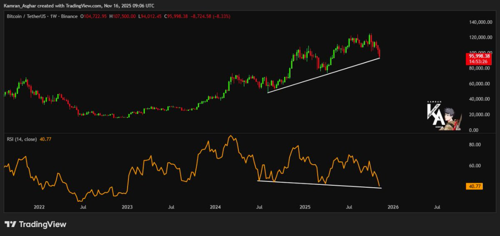 在周线维度,比特币价格形成更高低点的同时,RSI指标却下探至40附近新低。此类背离通常预示行情停顿或反转,特别是在大周期图表中出现时更具参考价值。