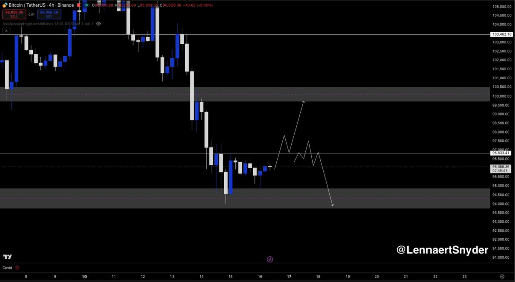 市场观察员LennaertSnyder指出正密切监测该价位:"关键阻力仍位于约96,830美元。"