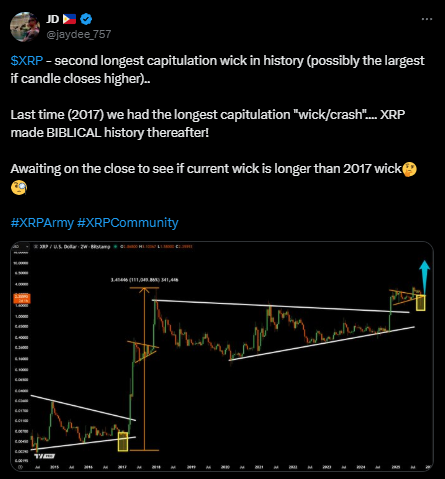 $XRP形成史上第二长投降下影线,有望超越2017年涨势前形态。 | 来源:JD, X