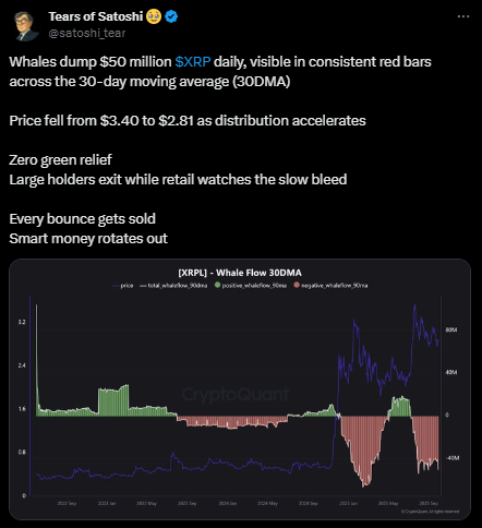 巨鲸每日抛售5000万美元$XRP。 | 来源:Satoshi, X