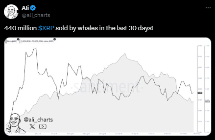 $XRP遭抛售4.4亿枚。 | 来源:Ali Martinez, X