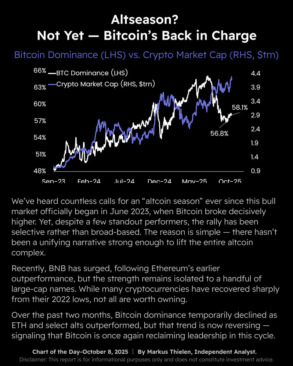 由于与比特币的强关联性,山寨币同样值得关注。但专家指出,不断攀升的比特币市值占比,可能推迟万众期待的山寨币季节。Matrixport最新报告显示,比特币持续跑赢其他加密货币——虽然BNB、以太坊等近期因比特币市值占比"暂时性"下降而显著上涨,但目前比特币正"重新夺回周期领导地位"。
