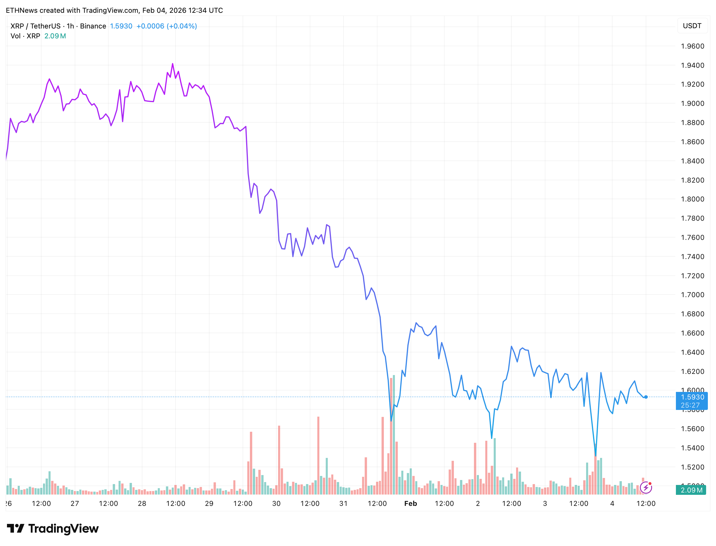 瑞波币当前结构的关键并非反弹尝试,而是卖压在何处停止加速。自1月下旬高点持续下跌后,价格现徘徊于1.59美元附近,守在一个下行动量明显放缓而非扩大的区域。