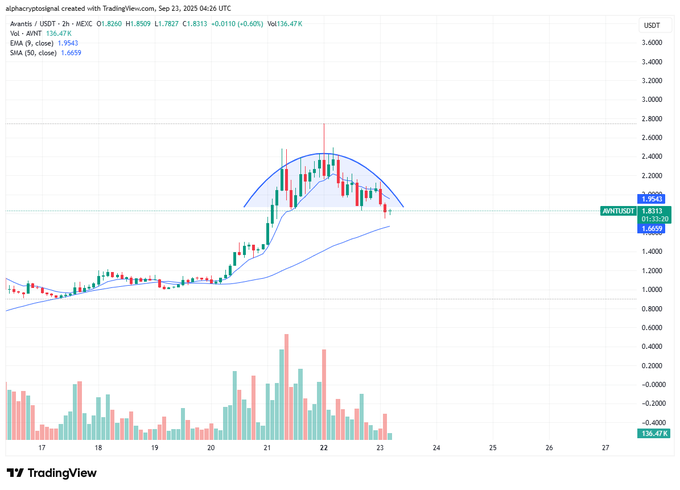 加密信号分析师Alpha Crypto Signal(@alphacryptosign)指出,AVNT在小周期图表上正形成圆弧顶形态。这种结构通常出现在迅猛上涨后需求逐渐减弱时。当价格从1.20美元区域飙升至2.60美元上方后,K线已开始逐步走低。