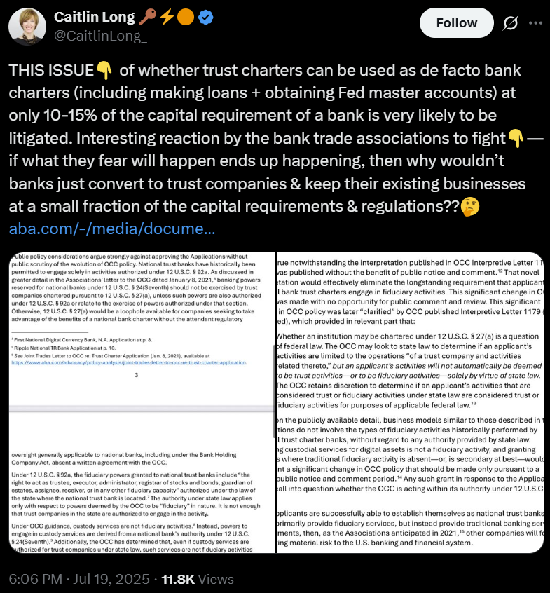 然而这项新兴倡议并非没有反对声音。银行和信用合作社 advocacy 团体已敦促OCC延迟向加密公司授予银行特许状,对政策风险和潜在安全问题表示担忧。Custodia Bank创始人凯特琳·朗反驳这些反对意见,认为此类法律挑战不可避免,特别是关于信托特许状是否能有效发挥事实银行牌照作用,使机构能够以更低资本要求发放贷款并接入美联储账户。