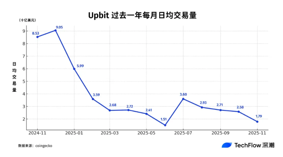 回溯去年12月3日韩国宣布戒严令时,交易所流量激增十倍,单日交易量跃升至275亿美元。而达到这一峰值后,韩国加密货币交易所便开始显露颓势。