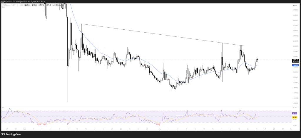 价格走势:现报2.87美元(24小时+13%),稳守近期波动中收复的2.50美元月线支撑。11月19日曾冲高至3.24美元,实现四日内急速上涨