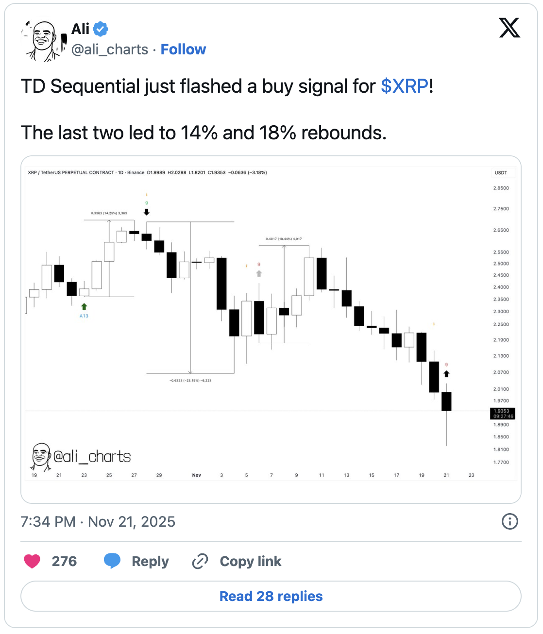 然而,分析师阿里·马丁内斯分享的链上数据表明,XRP可能即将出现短期缓解性反弹。用于检测市场枯竭和潜在反转点的TD Sequential指标,在XRP近期下跌后发出了“买入”信号。此前两次出现这种模式时,XRP分别上涨了14%和18%。如果出现类似的复苏,XRP可能会回升至2.20美元至2.30美元的区间。因此,尽管存在下行风险,许多投资者仍在讨论当前水平是否提供了机会。