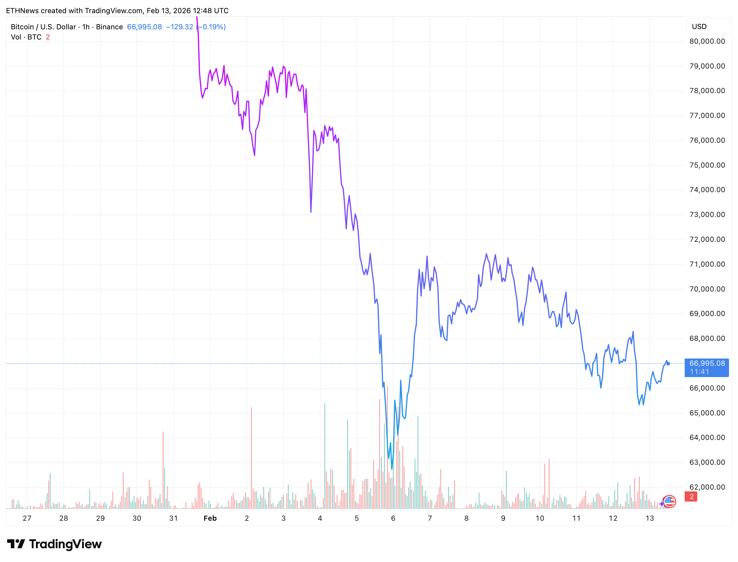 经过这轮清洗后,价格进入震荡整理阶段。图表显示在反弹至71,000美元后形成一系列更低的高点,表明看涨动能目前仍受限。但与早期下跌相比,抛售强度已明显减弱。