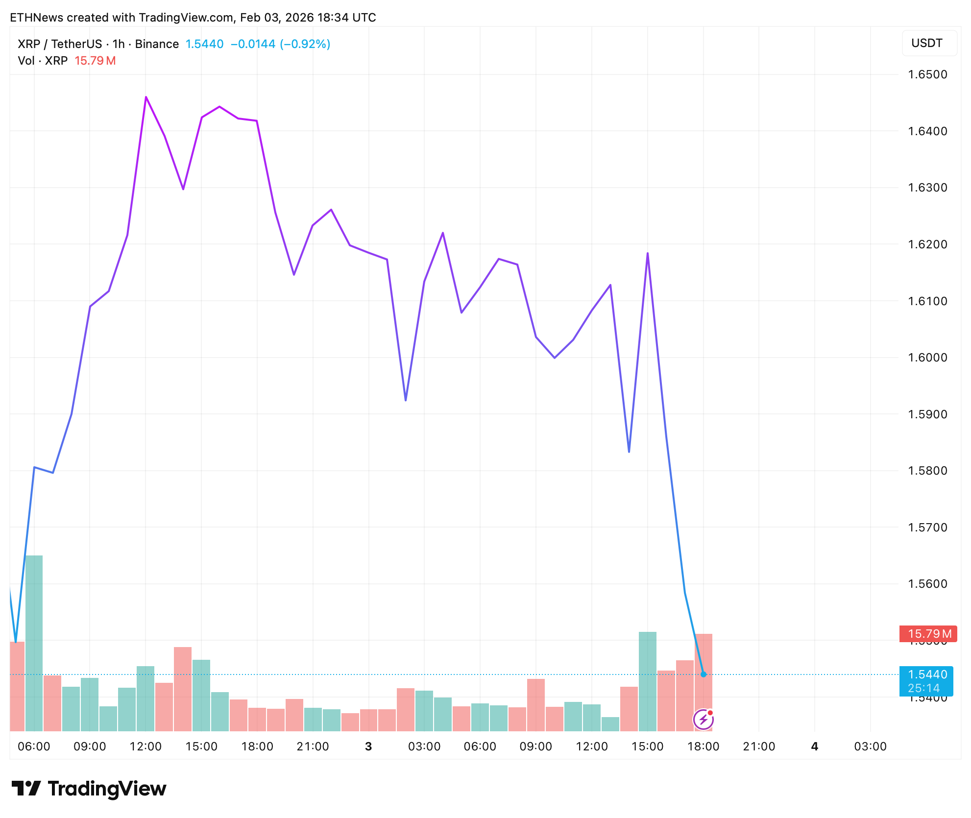 XRP目前交易价格约为1.54美元附近,过去7日内跌幅达18%。此前盘中价格急跌,使其回落至近期波动区间的低位。由于多次反弹未能站稳上方阻力,短期结构已遭到破坏,临近收盘时抛压进一步加剧。