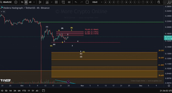 分析师More Crypto Online (@Morecryptoonl) 指出,Hedera Hashgraph (HBAR) 仍处于修正阶段,尚未确认向上突破。只有当价格强势突破0.217美元水平,才能确认看涨反转并开启新一轮上升浪。