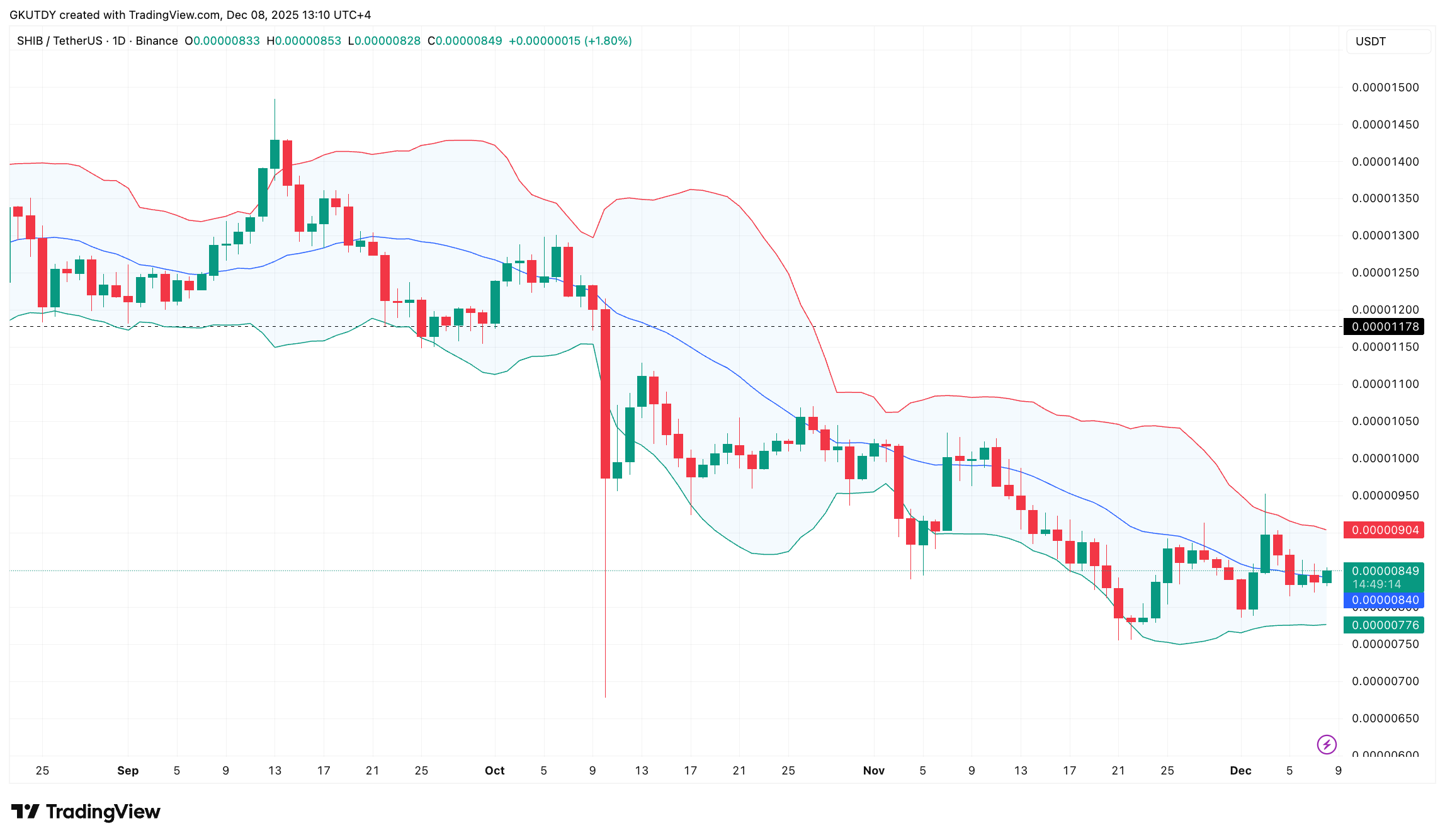 这一形态的基础是 SHIB 在 0.0000084–0.00000847 美元区间形成的强力支撑。即便其他主流山寨币表现不稳,该支撑区域依然稳固,为买家提供了可靠的操作基础。只要 SHIB 持稳于该支撑之上,下一步目标就很明确:测试布林带的上轨,该位置正好对应 6.66% 的涨幅延伸。