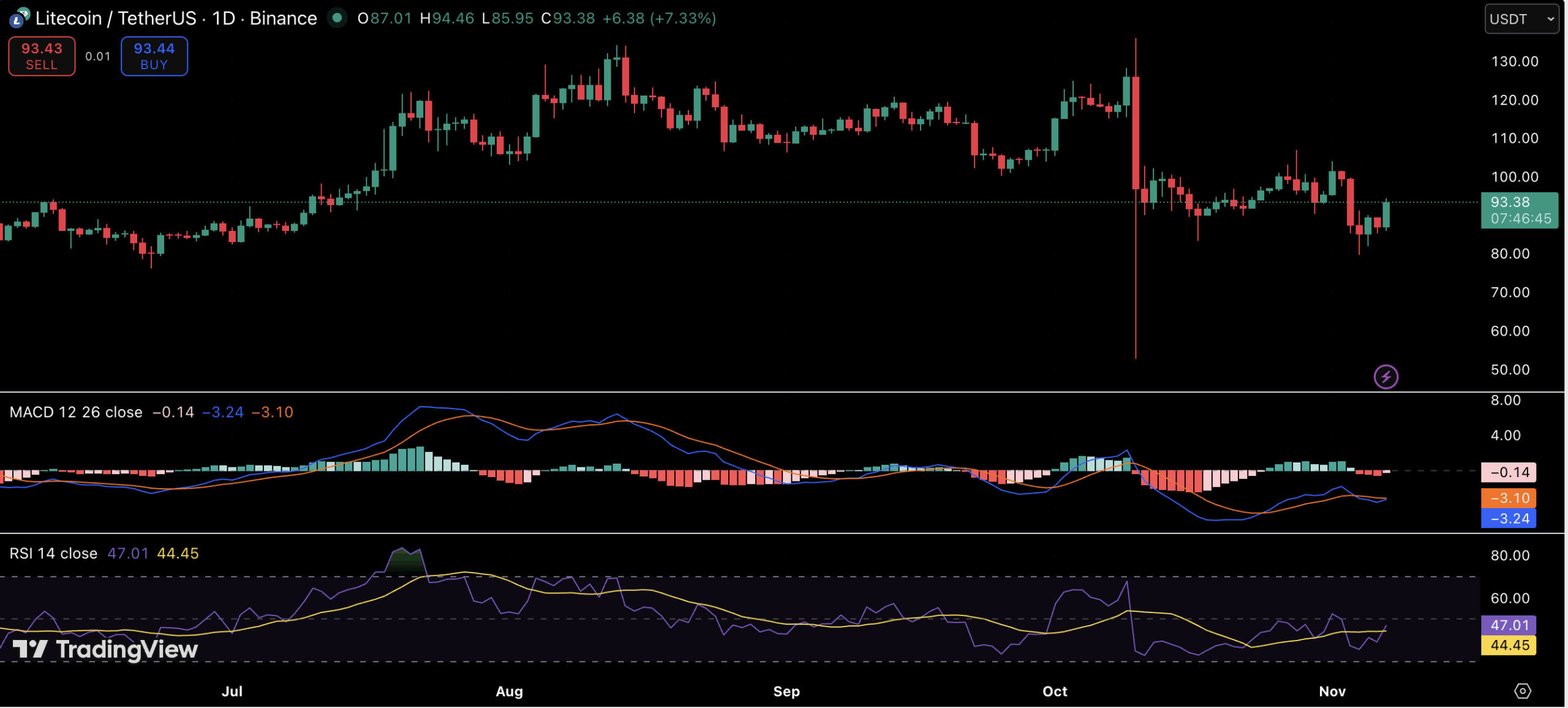 日线图上,莱特币已突破短期阻力位,相对强弱指数(RSI)升至47显示市场情绪改善,MACD指标在长期看跌后出现收敛迹象。价格走势暗示莱特币可能再次尝试冲击100美元心理关口,下一个关键阻力位在110美元附近。分析师指出,尽管市场整体波动,该资产数月来始终维持在上升趋势线上方。