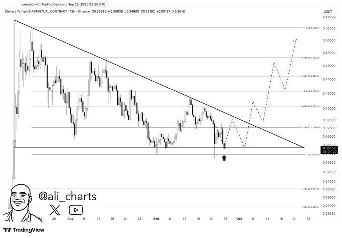 分析师Ali(@ali_charts)将0.34美元定义为恒星币的生死线。其分析图表显示该水平构成横向底部,多次测试均触发反弹。当前K线结构呈现收窄的下降三角形,预示突破在即。
