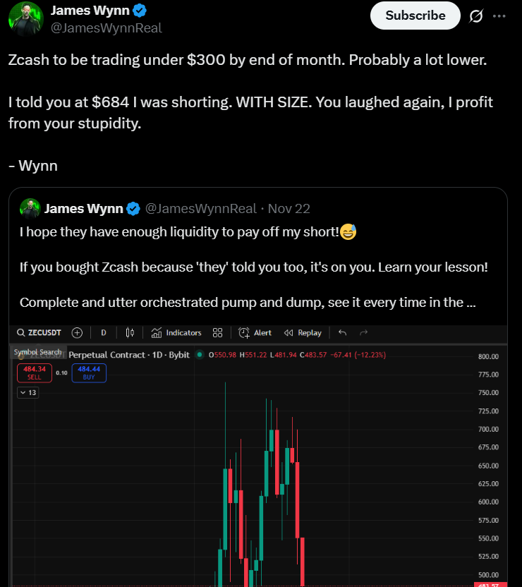 尽管有明确迹象表明Zcash的抛物线上升阶段可能已经结束,但其价格仍持续展现出看涨韧性。部分投资者对其延续涨势保持信心,而另一部分则预期会出现更大幅度的回调。知名Hyperliquid巨鲸詹姆斯·温恩属于看跌Zcash的投资者阵营,他在近期发文中预测这款隐私币将在11月底前跌至300美元价格区间。