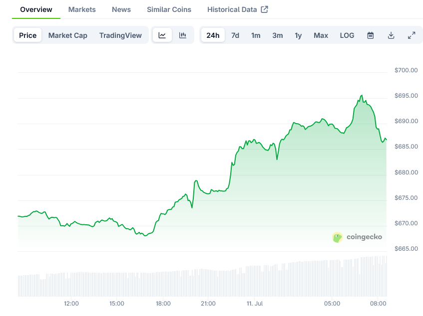 BNB价格突破666美元阻力位后,24小时内上涨1.26%,达到672.49美元