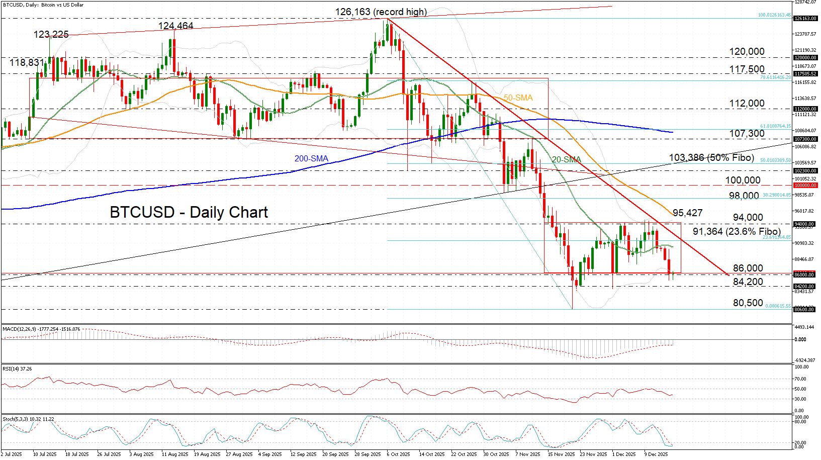 BTCUSD在86,300附近尝试反弹,该位置是86,000至94,000相对宽幅一月区间的下轨。此前价格在区间上轨(与短期下行趋势线重合)遭遇强烈抛压,过去四个交易日累计下跌超过7.3%。市场情绪持续低迷,近几周比特币交易所交易基金资金流入持续疲软,这种态势抑制了上行动能——自10月20日创下126,163美元历史峰值后,这种最大加密资产已跌至11月21日80,615美元的谷底。