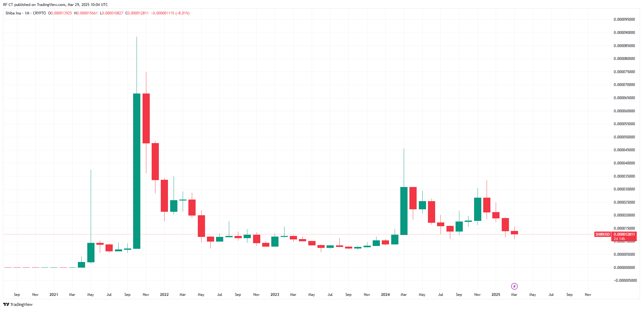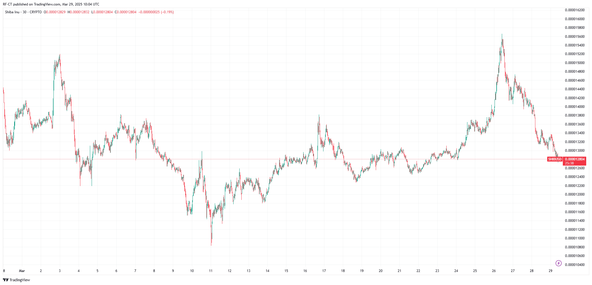 截至2025年3月29日,SHIB的交易价格约为0.00001282美元,日内小幅下跌,但仍保持在0.000012美元的主要支撑位上方。尽管出现小幅反弹,但RSI和MACD等动量指标显示,熊市压力仍在持续,这反映了整体市场的情绪。
