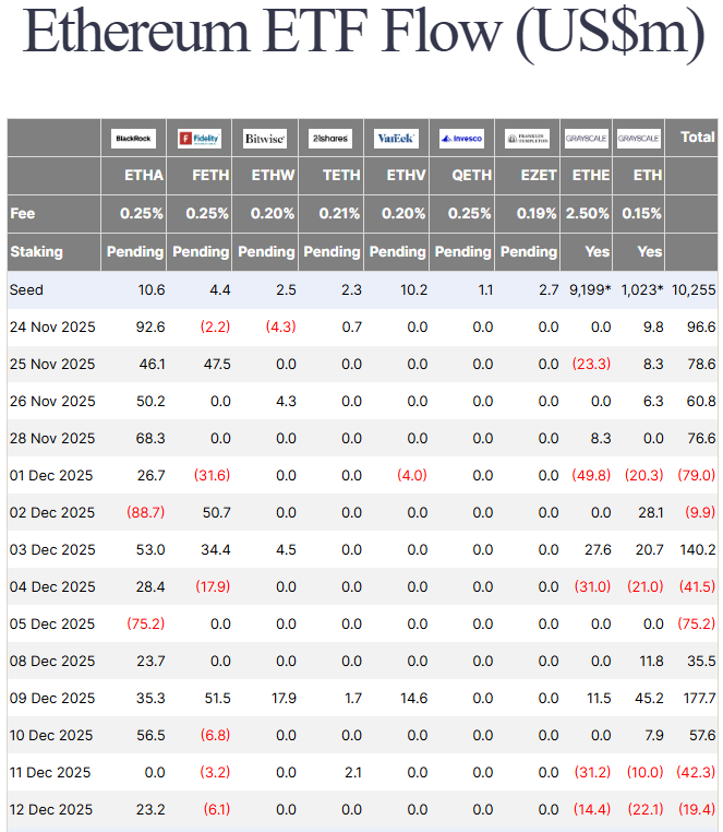 具体数据显示,美国现货以太坊ETF在12月12日录得1940万美元资金流出,形成连续两日流出态势。不过贝莱德以太坊ETF同日获得2320万美元资金注入,而该投资工具在12月11日曾出现4230万美元资金流出。尽管最近两日呈现资金外流,截至12月12日当周,美国现货以太坊ETF仍实现2.091亿美元净流入。这表明机构投资者近期态度转向谨慎,特别是在加密货币市场整体波动加剧的背景下。