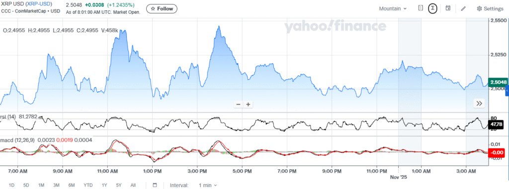 周五XRP主要围绕2.50美元窄幅震荡,波动区间仅0.04美元,显示出典型的低波动特征。尽管盘中出现小幅震荡,但价格始终稳固保持在2.50美元支撑带上方。当日涨幅1.24%反映市场呈现温和买入态势,2.53美元的短暂突破后回落表明上行动能有限,而2.49美元关口的稳固防守则暗示市场存在潜在支撑。