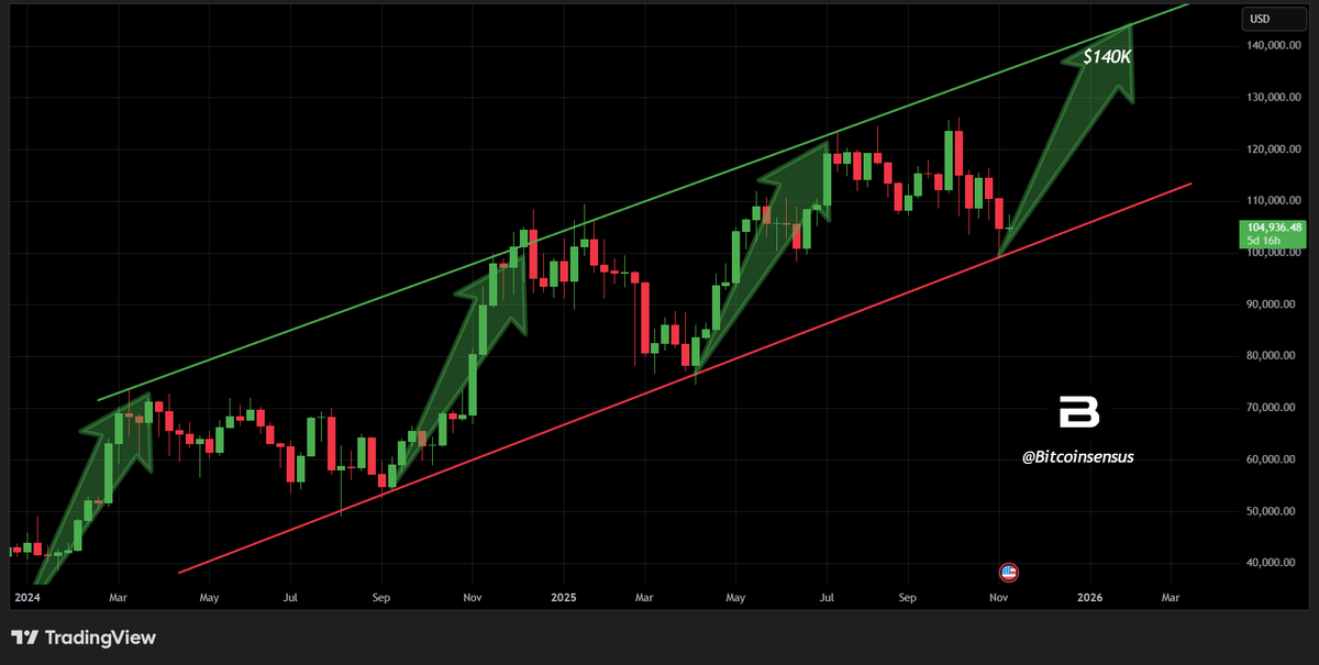 分析师平台Bitcoinsensus指出,比特币仍维持在长期平行上升通道内,该结构自2024年初以来一直主导价格走势。若通道在未来数月保持完整,图表上轨显示可能在14万美元附近面临重测。