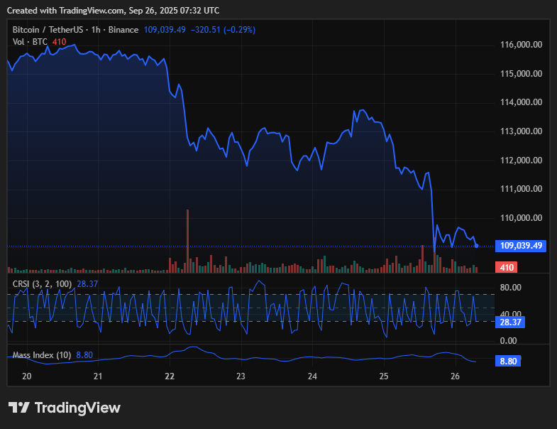 本周比特币承受新压力,价格快速跌破110,000 USDT,这标志着市场进入关键修正阶段。相较于此前约116,000 USDT的高点,数字货币在短短几个交易日内完成剧烈回调。分析师们正密切关注可能形成的下降扩散楔形,该形态或将决定比特币的下一步走向。