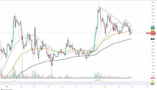 相对强弱指数(RSI)现报44,显示中性偏弱动能。反弹期间既未出现明显的看涨背离信号,成交量也令人失望,加剧了市场对复苏力度的疑虑。缺乏强劲买盘支撑的情况下,难以判断当前反弹能否转化为持续上涨行情。
