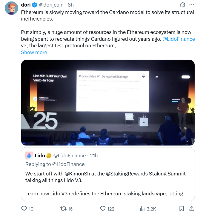 当前以太坊资讯聚焦于两大网络应对结构效率差异的路径。分析师指出Lido的v3升级使以太坊采用了近似卡尔达诺沿用多年的模式,这一观点引发广泛讨论。新版协议允许无许可质押池创建,运营商可自主构建托管池并配置运行参数。卡尔达诺自始便采用此种模式,任何用户均可组建质押池参与生态。