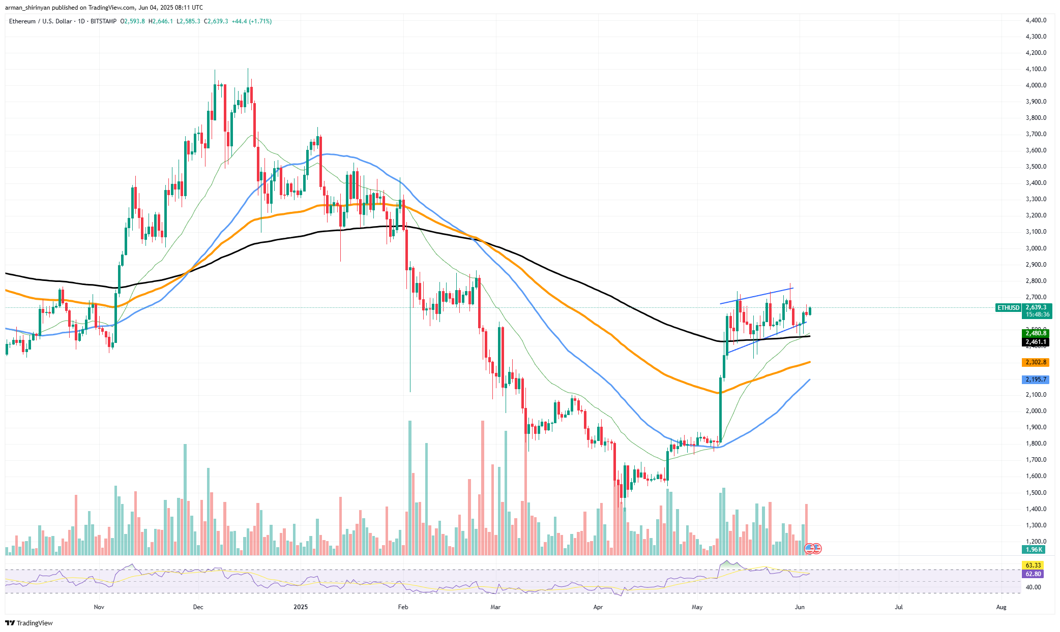以太坊价格图表的技术分析似乎佐证了这一判断:ETH已从5月初形成的上升支撑趋势线完美反弹,目前重新站上2,650美元关口。更重要的是,这次反弹伴随成交量放大,这对维持看涨势头至关重要。当前RSI指标接近63,仍处于健康区间,意味着存在上行空间且未进入超买区域。若ETH突破2,750美元阻力位,或将确认牛市延续态势,进而挑战3,000美元心理关口。