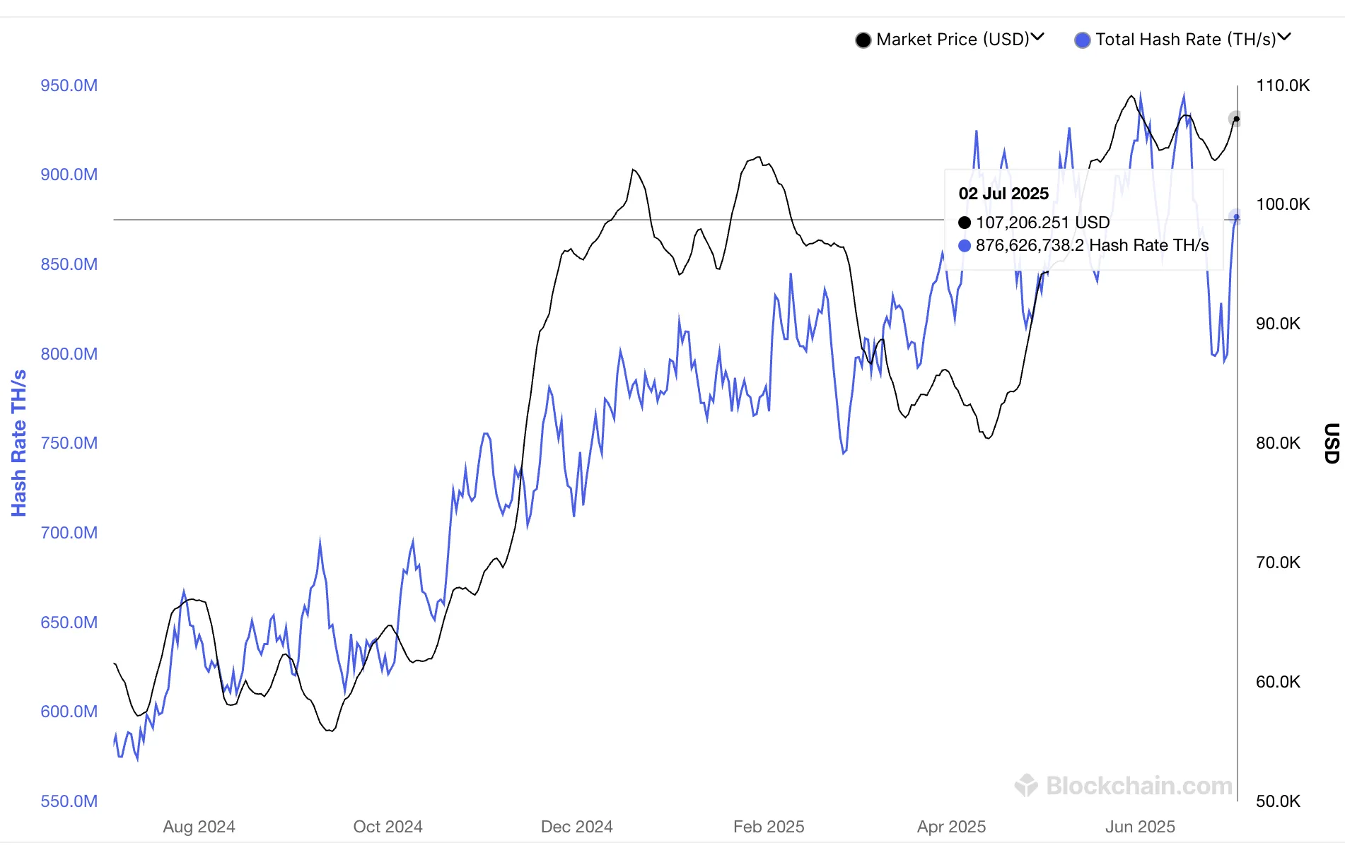 据此前报道,2025年6月成为比特币网络算力的转折点。极端高温天气冲击矿场运营,德克萨斯州和中国等地区因机器效率降低迫使矿工暂停或缩减业务。此外,